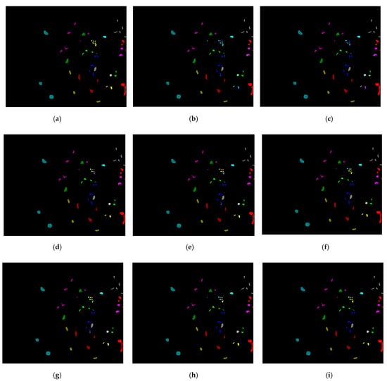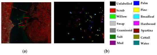 The KSC dataset was collected from mixed vegetation near Kennedy Space Center by the airborne visible/infrared imaging spectrometer (AVIRIS) of the National Aeronautics and Space Administration (NASA) on 23 March, 1996. The image size is pixels with a spatial resolution of 18 m. Some atmospheric water absorption bands and low signal-to-noise ratio (SNR) bands were discarded, and only 176 bands were reserved for analysis. A total of 13 categories and 5211 labeled samples were calibrated, as shown in Figure 7 [37].