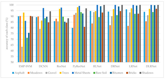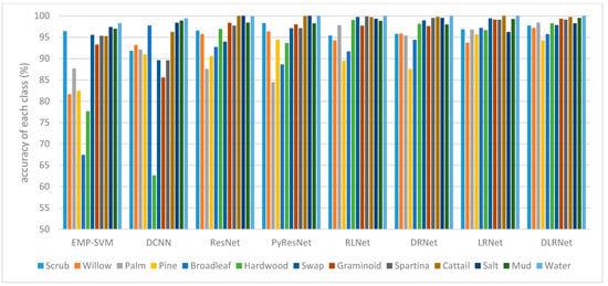 It can be seen from Table 2 that the highest OA on PaviaU dataset is 91.12%, which is an increase of 2.16%, 1.48%, 0.8%, 0.22%, 1.56%, 2.05% and 1.84%, respectively, compared with EMP-SVM, DCNN, ResNet, PyResNet, RLNet, DRNet and LRNet. It can be seen from Table 3 that the highest OA obtained by this classification model on the KSC dataset is 98.61%, which is an increase of 6.4%, 5.6%, 1.82%, 1.68%, 0.83%, 0.99% and 0.49%, respectively, compared with EMP-SVM, DCNN, ResNet, PyResNet, RLNet, DRNet, and LRNet, which fully proves the effectiveness of DLRNet model hyperspectral data classification with small samples. Figure 8 and Figure 9 show the classification results of different methods for each class on the PaviaU and KSC datasets, respectively.
