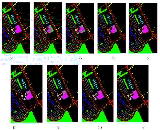 Classification results of Pavia University dataset. (a) Ground truth; (b) EMP-SVM; (c) DCNN; (d) ResNet; (e) PyResNet; (f) RLNet; (g) DRNet; (h) LRNet; (i) DLRNet.