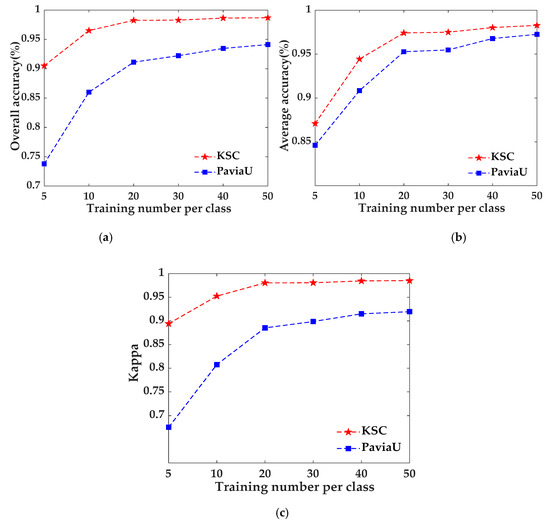 The effect of training number per class on classification accuracy. (a) OA; (b) AA; (c) K.