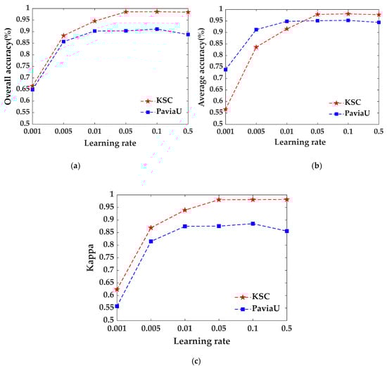 The effect of learning rate on classification accuracy. (a) OA; (b) AA; (c) K.