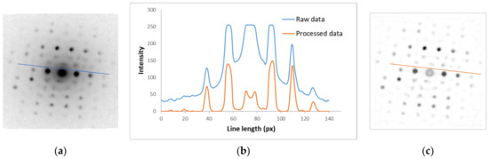 Background subtraction: (a) the raw diffraction pattern contains 144 × 144 pixels, (b) the intensity profiles before and after image processing are compared, (c) relative intensities are obtained by subtracting the background intensity computed around the current location with a radius of 5 pixels; Note that the transmitted beam is damaged because its size exceeds the selected radius.