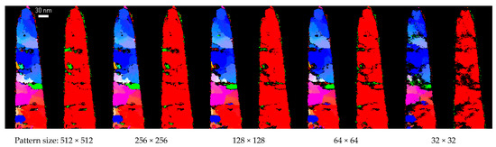 In the standard procedure, the raw patterns are acquired on-line with an optical camera placed outside the TEM column. When scanning at high scan speeds, which may be hundreds of frames per second, the collected intensities are low such that binning (i.e., adding intensities of neighbouring pixels) is systematically performed. This substantially reduces the pattern resolution. The current trend in electron microscopy is to introduce new detectors which are faster and more sensitive but that also contain more pixels, up to several millions. While there is no doubt that orientation and phase mapping will benefit from these recent evolutions in hardware, this also comes with a tremendous increase in data size and acquisition time. To this respect, acquiring high resolution diffraction patterns is questionable, at least when templates are used to recognize the pattern. Figure 2 compares orientation and phase maps generated with patterns acquired with a 4k × 4k CMOS detector (TemCam-XF416-TVIPS) binned on-line to 512 × 512 pixels and further binned numerically to 256 × 256, 128 × 128, 64 × 64 and even 32 × 32 pixels for the sake of comparison.