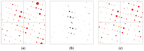 Indeed, template matching implies that only a small fraction of the pattern will match the template. In the current approach, the theoretical pattern does not reproduce the entire diffracting signal but only the most relevant part of it. More precisely, a template contains typically less than m′ ~ 100 datapoints Ti(x,y), each being representative of the position and the intensity of one reflection. This differs from a full cross-correlation approach where the entire simulated pattern is reproduced and compared to the raw data [10]. The processing time is tremendously reduced by considering such a minimal representation of the pattern. For example, even if the size of the collected pattern is not more than 144 × 144 pixels—the standard size used in the present approach—the number of operations in Equation (1) is reduced from m ~ 2.104 (total number of pixels) down to m′ ~ 100 (non-zero pixels in the template).