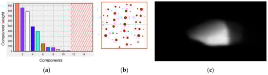 Frozen template VDF image construction: (a) the components are sorted by size and the smallest ones omitted, (b) each component is associated to a template, the one shown corresponds to the white bar in (a), the template is used as a multiple hole aperture to produce (c) a frozen template VDF image.
