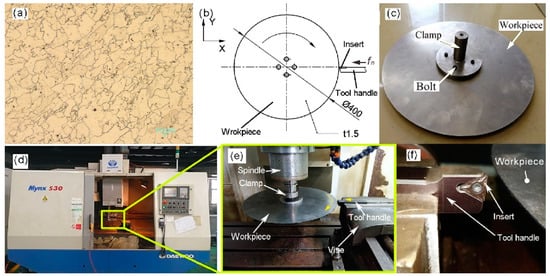 An as-received pure iron type DT8 was used in the current turning experiments. The chemical compositions and main mechanical and physical properties of the pure iron are listed in Table 1 and Table 2, respectively. The metallographic structure of the pure iron DT8 is shown in Figure 1a. In order to obtain high cutting speeds, a circular disc of pure iron with a diameter of 400 mm and a thickness of 1.5 mm was used in the turning experiments (Figure 1b,c). The disc was obtained from the as-received 1.5 mm thickness cold-rolled iron sheet by laser cutting and was fixed on a clamp with four bolts (Figure 1c). The clamp was installed on the spindle of a CNC machining center type Daewoo mynx530 (Figure 1d,e). A chip collection device was used to enclose the workpiece, the spindle, and the cutting tool to prevent the chips flying out for the chip collection.