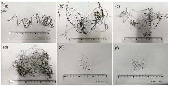 Chip shapes at different cutting speeds: (a) 1000 m/min; (b) 3000 m/min; (c) 5000 m/min; (d) 7000 m/min; (e) 8000 m/min; (f) 9000 m/min.