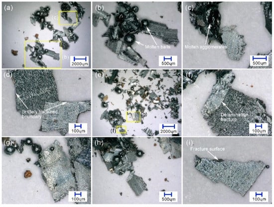 The higher magnification photograph of the chips in Figure 2e,f are shown in Figure 4; the chips shown in Figure 4a–d are obtained at cutting speeds of 8000 m/min, and those in Figure 4e–i are obtained at 9000 m/min. It shows that the grain chips in Figure 2e,f are tiny flakes, fragments, or molten balls of the removed workpiece material, 300–1000 µm in size. At a cutting speed of 8000 m/min, the main types of the chip shape are molten balls (Figure 4b), irregular molten agglomerates (Figure 4c), and flakes (Figure 4d). According to [], the molten balls of the chips in the cutting experiment are molten due to the high heat released from the oxidation of the chips when they are heated by the cutting heat and fly into the air. The flake chips shown in Figure 4d have sharp boundaries, indicating that the flake chips are formed by brittle fracture. The color of the flake chips is bright silver, indicating that the chips are formed at a low temperature without high temperature oxidation. The chips at 9000 m/min are similar to those at 8000 m/min, but the molten balls and irregular molten agglomerates seems smaller (Figure 4g). Figure 4f shows that the chip has not only a clear fracture boundary but also delamination fractures. Figure 4h shows an agglomerate like that in Figure 4b, but the melting degree seems lesser. Figure 4i shows a neat brittlely fractured chip similar to that in Figure 4d. These results indicate that the embrittlement of the chip material of the pure iron occurs when the cutting speed reaches 8000 m/min.