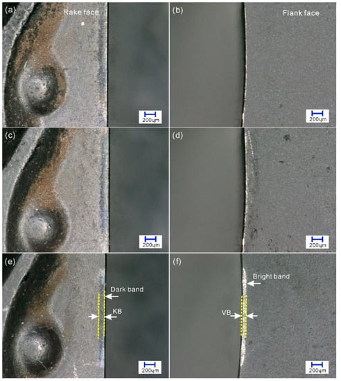 Wear morphologies of cutting tools at different cutting speeds under optical obversion. (a,c,e) are the rake faces of 1000, 4000, and 8000 m/min, respectively; (b,d,f) are the corresponding flank faces.