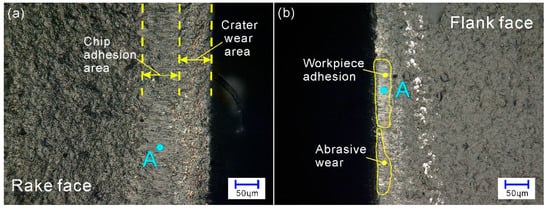 The dark bands are the wear marks on the rake face of the cutting tool. Figure 6a shows that the dark band consists of two portions: one is crater wear area; the other is chip adhesion area. In the crater wear area, the surface looks like the initial surface of the cutting tool, and no visible crater can be found in the area, which means that the crater wear in the rake face is slight in the cutting length of approximately 4000 mm with a cutting speed of 1000 m/min. In the adhesion area, there is a thin layer of workpiece material that sticks on the surface of the cutting tool.
