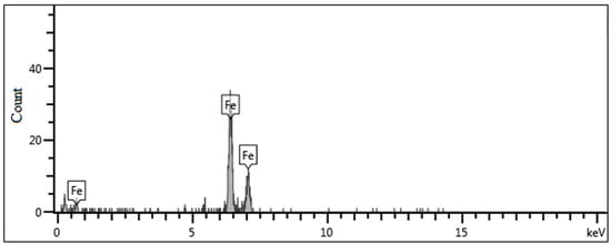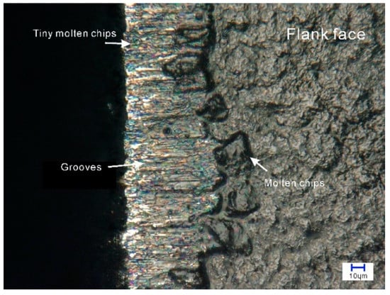 Figure 8 shows the typical wear morphology of the flank at 8000 m/min. There are many parallel grooves on the worn surface of the flank of the cutting tool. These grooves are ploughed by the hard parties from the workpiece material [], meaning severe abrasive wear takes place in the cutting process at cutting speed of 8000 m/min. In the abrased zone, there are a large number of tiny molten balls. On the outside of the abrased zone, there are large drops of melted chips, indicating that the temperature in the tool–workpiece contact zone has, at some point, reached the melting point of pure iron (1538 ℃). The black color of the adhered melted chips means that the oxide Fe3O4 of the workpiece material has been produced, which easily happens when a tiny piece of iron is heated in the air [].