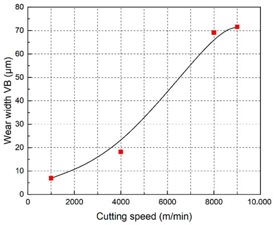The average wear width of the flank VB is shown in Figure 9. It can be seen from the figure that the wear of the flank is intensified with the increase in the cutting speed. A sharp increase in the wear occurs when the cutting speed is higher than 4000 m/min. In the cutting length in the current cutting experiment, there is almost no wear in the flank face at 1000 m/min. The wear width VB is approximately 20 μm at 4000 m/min, while at 8000 and 9000 m/min, the average wear width VB reaches approximately 70 μm.