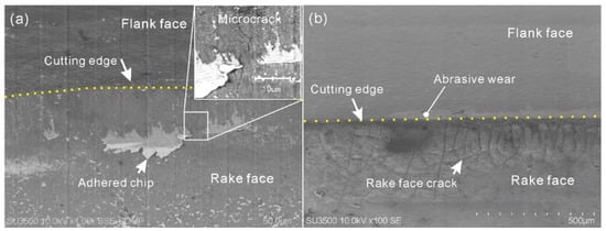 The tool rake faces at 4000 and 8000 m/min were further observed under SEM (Figure 10). It can be seen from Figure 10 that there are some adhered chips but there is no obvious wear on the rake face of the insert at 4000 m/min. On close observation, the figure in the upper right corner of Figure 10a shows there is a crack in the rake face. At 9000 m/min, obvious cracks were found in the rake face, while there no similar cracks in the flank face except the worn surface caused by abrasive wear.