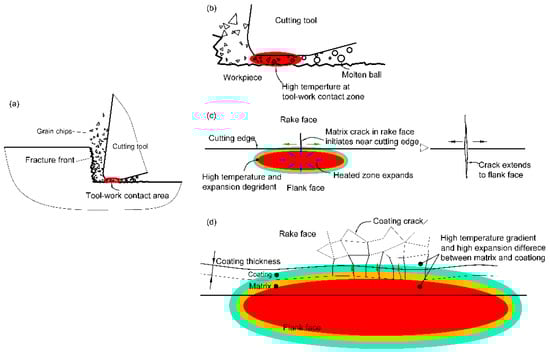 Schematic representation of the high-gradient temperature distribution at tool–workpiece contact area and its effect on chip formation and cutting tool crack in HSM. (a) general layout; (b) high temperature point when workpiece is completely brittle; (c) matrix crack initiation and extension in the cutting edge; (d) coating crack formation in the rake face.