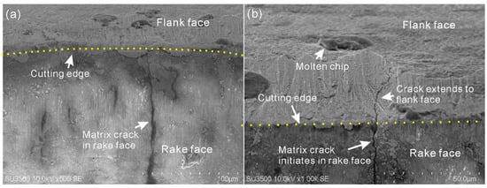 With the cutting speed of 8000 m/min, the period of the cutting state, from cutting into the workpiece to a stable cutting, is very short (approximately 0.005 s), during which the contact temperature between cutting tool and machined surface of the workpiece increases from 20 ℃ to approximately the melting point of the workpiece (1538 ℃). This will inevitably lead to a high temperature gradient and a consequent thermal expansion difference in the ambient zones of the tool–workpiece contact zone (Figure 12c). The instantaneous high temperature destroys the heating symmetry in the cutting tool–workpiece contact zone. An expansion zone with compressive stress is formed in the center of the tool–workpiece contact zone, and a tensile stress zone is formed around the center of the tool–workpiece contact zone, including the adjacent rake face. When the temperature gradient and thermal expansion difference are high enough, cracking of the rake face coating or even the matrix of the workpiece will initiate (Figure 12c,d). Moreover, due to the low structural strength of the cutting edge, the cracking is easily started in the rake face side of the cutting edge and then transmitted to the rake face. This is can by validated by the matrix crack shown in Figure 13. It shows that the cracks in the matrix are perpendicular to the cutting edge, extending from the rake face to the flank face. The portion of the crack in the rake face is wider than the portion in the flank face, indicating that the crack originated in the rake face and then propagated to the flank face.
