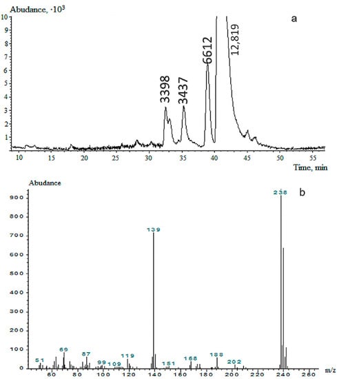 The identification of macro and micro components in the chlorination of 4-phenylphenol under conditions simulating the operation of a water treatment plant was considered []. The total ion current (TIC) chromatogram of the mixture is presented in Figure 1a. It was found that the mixture contains one mono-, three di- and two tri—chlorophenylphenols. According to the chromatogram in Figure 1a, the most intensive peak determined by the library search corresponded to 4-hydroxy-3,5-dichlorobiphenyl. The mass spectrum of the main component of the mixture is shown in Figure 1b.