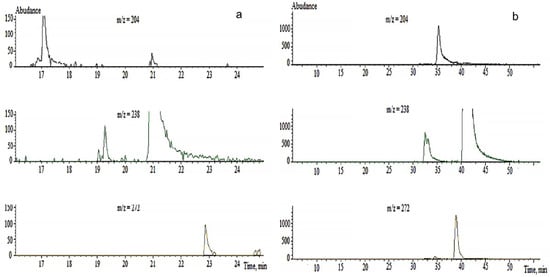 (a) Extracted ion chromatograms (EIC) for molecular ions of mono-, di- and trichloro- 4-hydroxybiphenyls (m/z = 204, 238, 272), obtained on a capillary column (b) and a column with GTCB.