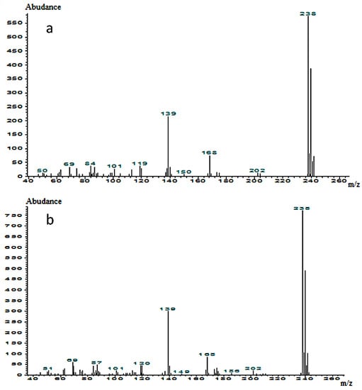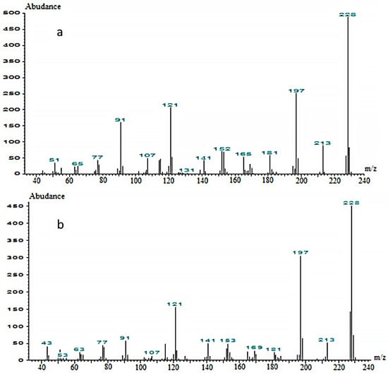 A library search in the database revealed the presence of 4-hydroxy-3-chlorobiphenyl and 4-hydroxy-3,5-dichlorobiphenyl in the mixture. However, the available data were insufficient to identify other compounds. Based on theoretical concepts of the chlorination process and the effect of substituents, it is impossible to predict with a high probability the full composition of the isomeric mixture. It should be noted that chlorine and phenyl activate the benzene ring in different ways. Secondly, since the process is not fully understood, the databases lack sufficient sets of mass spectra for a full analysis of the mixture. It is known that the methylation of isomers leads to differences in mass spectra []. Mass spectra for isomeric compounds were identical and the randomization of substituents was observed. Figure 3 shows examples of mass spectra of isomeric dichlorobiphenyls.