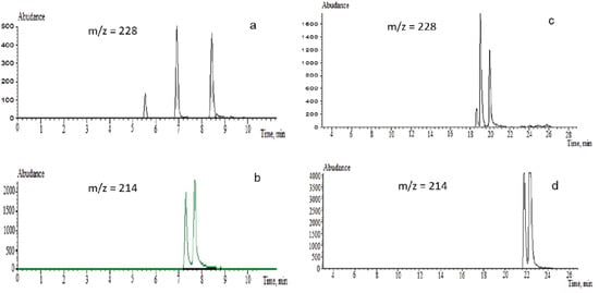 EIC obtained on capillary (a,b) and GTCB (c,d) columns, based on characteristic ions of isomeric dimethoxydiphenyls (b,d) and impurities (a,c).