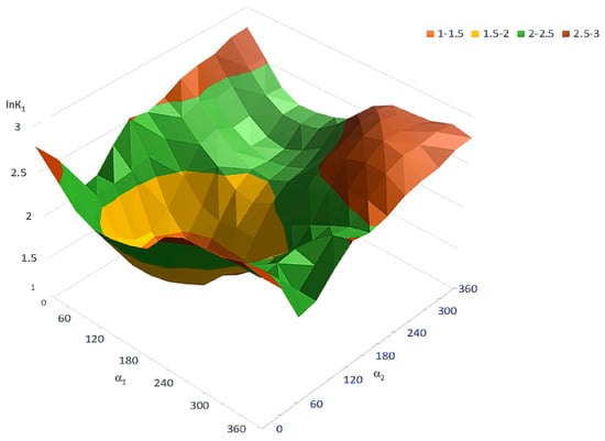 According to Figure 5, the rotation of the -OCH3 groups changes the lnK1 values from 1 to 3, similar changes were observed with the rotation of the inner angle in biphenyl. Thus, in further calculations the angle of internal rotation for isomers 2,3′- and 2,4′- dimethoxybiphenyls was taken equal to 54° []. The logarithm values of Henry’s constants depending on the angle of rotation of the methoxy group are given in Table 2.