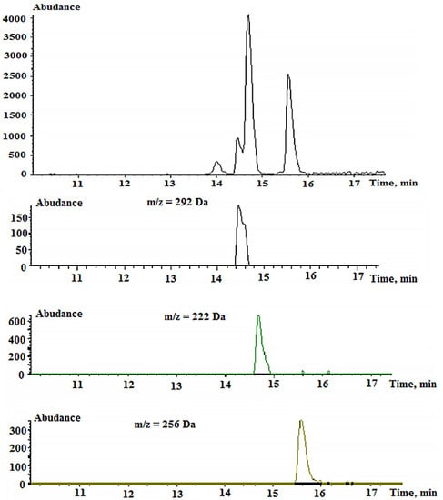 According to the calculated data, the retention of 4-hydroxy-3,5-dichlorobiphenyl is significantly lower than for 4-hydroxy-3,5,4′- trichlorobiphenyl. It is possible to select compounds corresponding to the observed order of isomer elution and degree of substitution taking into account the relative position of isomers in the chromatogram (Figure 2b). At the same time, due to a large number of isomers, the identification of compounds cannot be carried out correctly enough. However, it can be affirmed that the dichlorophenylphenols in the mixture are 4-hydroxy-2,3′- and 3,2′-dichlorobiphenyls, and trichlorophenylphenols are 4-hydroxy-3,5,2′- and 2,3,6-trichlorobiphenyls taking into account all available data.