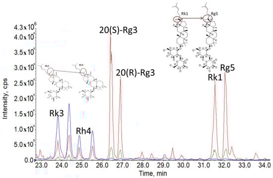 Selected ion chromatograms of chain isomers (Rk3 and Rh4, Rk1 and Rg5) and epimers (20(S)-Rg3 and 20(S)-Rg3). Blue refers to ginsenosides with protopanaxatriol sapogenin, red—protopanaxadiol sapogenin, and green is for sapogenin derivative from oleanolic acid.