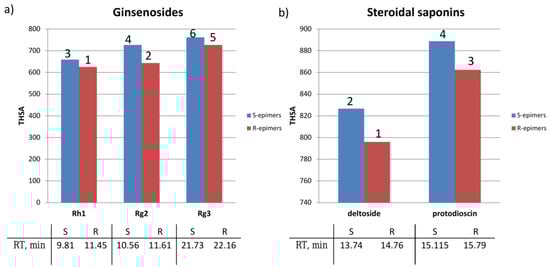 Chart of THSA with numbers indicating evaluated elution order and experimental RTs for S, R- (a) ginsenosides (b) and steroidal saponins.