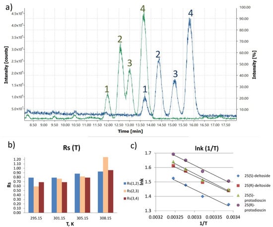 Chromatographic behavior of steroidal glycosides: (a) TIC obtained for 22 °C (green line) and 25 °C (blue line) of steroidal saponins: 1–25(S)-deltoside, 2–24(R)-deltoside, 3–25(S)-protodioscin, and 4–25(R)-protodiosin. (b) Bar chart of Rs for three pairs and for four temperatures. (c) Van’t Hoff plot for four temperatures.