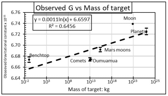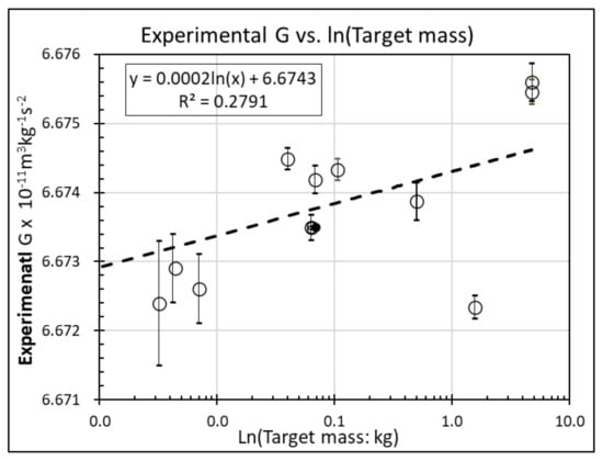 - Benchtop experiments = {6.674 + 0.000200 × ln(mtarget)} × 10−11