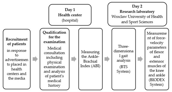 Patients applied for participation in the program in response to widely disseminated announcements in the media and health centers. Recruitment of patients to participate in the program was based on a medical consultation taking into account the inclusion and exclusion criteria and completion of preliminary examinations. During the medical consultation, which took place in the health care facilities in Wrocław, all patients had the ankle-brachial index measured. On the next day, in the research laboratories of the Wroclaw University of Health and Sport Sciences, a gait test was performed, followed by an assessment of the force-velocity parameters of the lower limb muscles. Individual tests were performed by a qualified technician of the device. A schematic of the study is shown in Figure 1.
