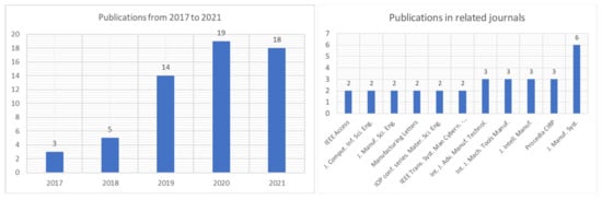 Nevertheless, the incorporation of the digital twin technology into the UPM design and control remains vague and sometimes contradictory. A literature search was undertaken in the Google Scholar database to survey the critical issues in the UPM design and control, and how to use the digital twin technologies to promote it. Google scholar’s database is widely recognized as the world’s most comprehensive academic search engine that records the peer-reviewed online academic journals, books, conference papers, dissertations, preprints, technical reports, and other academic literature, as well as patents. One shortcoming of using the Google Scholar database for literature review is the relatively low quality of retrieved results due to the wide range of literature sources, and therefore a manual theoretical screening process is conducted to identify high-quality papers. Firstly, two words “digital twin” and “precision machining” are used for retrieving related papers, which yields 87 papers (up to 30 June 2021). Secondly, 52 high-quality papers related to the UPM design and control are included via a theoretical screening process. Additionally, 12 other papers are added to make this review comprehensive; eventually, this review includes 64 references. The statistics of the collected literature are shown in Figure 1. From the year 2017 to 2021, research on digital twins-based UPM grows significantly. The top five most popular journals publishing the research on digital twins-based UPM include Journal of Manufacturing Systems, Procedia CIRP, Journal of Intelligent Manufacturing, International Journal of Machine Tools and Manufacture, and The International Journal of Advanced Manufacturing Technology.