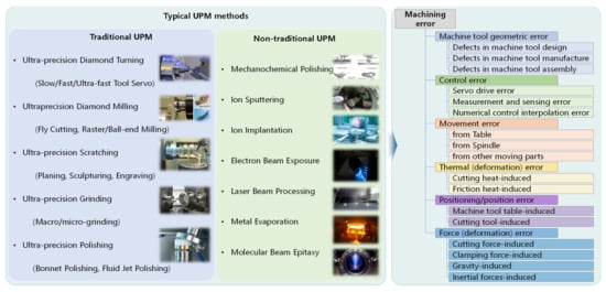However, it still depends on the precise equipment, together with its control system, to obtain the ultra-precision machining accuracy and surface roughness. The machining error refers to the transformation of the relative motion of the cutting tool and the workpiece-in-process in the machining state, due to the unbalanced thermal distribution of the UPM equipment and the machining load, which is specifically reflected in the position error, shape error, and surface roughness of the workpiece. As shown in Figure 2, there exist many sources resulting in machining errors in UPM. The machining accuracy and surface roughness of the workpiece-in-process mainly depends on the mutual position between the workpiece-in-process and the cutting tool in the machining process. It generally includes machine tool geometric error, control error, thermal (deformation) error, force (deformation) error, motion error, and positioning error.
