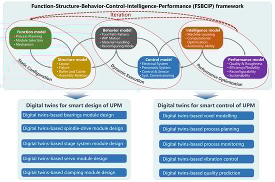 Abstracting and using the above six models in digital twins could benefit the accuracy and efficiency of the design and control of UPM equipment. In fact, the FSBCIP framework could be divided into two levels, namely, the basic Function–Structure–Behavior level, and the advanced Control–Intelligence–Performance level. The following two sections will review the digital twins-based UPM design and control from these two levels, respectively.