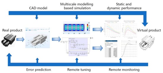Bearings (e.g., mechanical type, hydraulic type, and aerostatic type) are important components in the UPM equipment. Additionally, the motion accuracy, max speed, and friction are critical indexes to evaluate its performance. The use of air float, liquid float, and other ways in the bearing, guide rail, and balance mechanism has become an inevitable choice to realize the high resolution and real-time requirements. How to achieve precision, reliability, and sustainability in the design and operating of bearings faces many uncertainties for addressing rapid-changing requirements in diverse UPM scenarios. A balance among the design parameters, including available feed velocity, achievable precision, and resulting friction force, is desirable [14]. Gou et al. [9] built a multi-scale modeling and analysis kernel of the digital twin for simulating the mechanical design, direct-drive and control, dynamics tuning, and entire mechatronic system integration of the aerostatic bearing slideways (Figure 4). They defined that the bearing slideway digital twin is the collection of all digital artifacts that accumulate during its development, integrating all data that is generated during product design and use. Based on the digital twin approach, the performance of the designed aerostatic bearing slideways can be predicted and assessed in the operating process, and thus helping Research and Development engineers to carry out product iteration and design optimization.