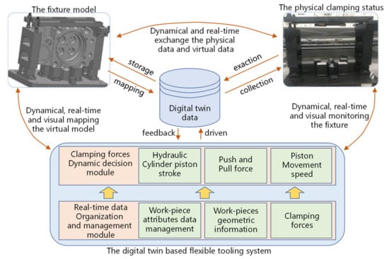 Dynamic clamping of workpieces is critical to shortening the preparation time of manufacturing. Computer-aided design tools are critical for the verification of design quality. Kang et al. [15] introduced a comprehensive computer-aided design verification model for fixture designing, using geometric and kinetic models for locating tolerance assignment, determining the required minimum clamping force, and verifying the fixturing accuracy and stability in the UPM process. As shown in Figure 5, Liu et al. [13] proposed a digital twin-based flexible tooling system that supports real-time geometry data-driven dynamic decision of the clamping forces and positioning. The clamping accuracy and efficiency could be improved based on the digital twin technology. Compared to the traditional fixture, planners can clamp the workpiece more clearly and effectively based on the digital twin model.
