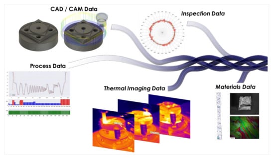 Digital twins-based voxel modeling has attracted much attention. For instance, Feldhausen et al. [21] presented a prototype system for collecting, synchronizing, fusing, and analyzing multiple streams of machining data, which supports creating and spinning the Digital Thread (Figure 6). They defined the digital thread as the integrated collection, storage, and analysis of spatial and temporal information relating to a manufactured component’s lifecycle from cradle to grave. Machining data was captured using MTConnect protocol, and could be associated with the spatial location data; in the meantime, the thermal images are captured and associated with UPM operations. Saleeby et al. [20] synchronized the in situ manufacturing process and correct geometric deviation information from multi-sensors to improve the accuracy of voxel digital twin models of the workpiece-in-process. Their experiment result showed the proposed approach could improve the accuracy of in situ digital twin models by up to 52%.