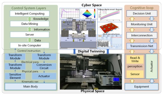 The UPM equipment is a complicated system integration of different functional modules. The design and control of UPM essentially involve the functional, structural, and behavioral aspects. As shown in Figure 3, incorporating digital twins into UPM design and control could be implemented according to Function–Structure–Behavior–Control–Intelligence–Performance (FSBCIP) framework [5]: (1) The function dimension is a formal characterization of the activities and their relationships for machining the workpieces/features; (2) The structure dimension is a formal characterization of the fusion, connection, and assembly relationships of the mechanical modules that fulfill machining functions; (3) The behavior dimension is a formal characterization of the mechanical motion transmissions, the motion form transformations, and mutual relationships (e.g., force, displacement or velocity); (4) The control dimension includes the structural, operational, or calculus of a process by statistical or engineering approaches to regulate the outputted machining process; (5) The intelligence dimension describes, develops, and verifies the learning ability, optimization ability, and autonomy ability of a UPM from the control algorithm viewpoint; and (6) The performance dimension evaluates and optimizes the system performance including accuracy, efficiency, flexibility, reliability, and adaptivity.