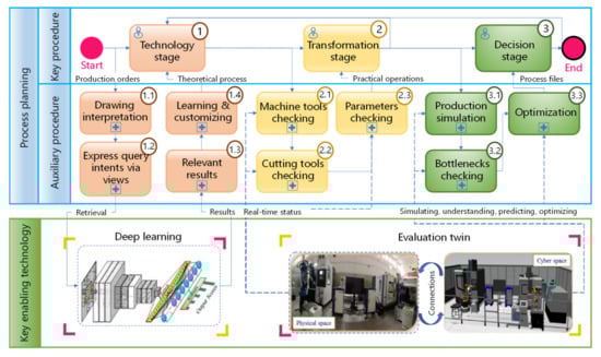 Zhang et al. [39] proposed a deep learning-enabled smart process planning approach towards a digital twin manufacturing cell (Figure 8). They defined the digital twin manufacturing cell (DTMC) as an integrated multi-physics, multiscale, probabilistic simulation model of a manufacturing cell which can intelligently perceive, simulate, understand, predict, optimize, and control to maximize the part quality and throughput, while maintaining flexibility and reducing cost. The embedded deep residual network-based process knowledge reuse network can understand the design intents expressed in a CAD drawing, and automatically extract knowledge for rapidly generating reference process models. An evaluation twin is built to generate an optimal process plan by combining the twin data with the reference process models. The case study showed that the cyberspace could help planners visually understand and predict manufacturing performance to select an optimal process plan with a trade-off of manufacturing capacity, time, and cost.