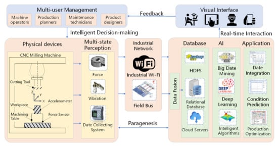 Digital twins provide new perspectives for process monitoring and prediction of UPM and enabling the influence evaluation of working conditions on the tool and the decision support of the process adjustment. Liu et al. [44] proposed a digital twin-based machining process evaluation method to improve product quality under the dynamic changing of the machining status. Zhu et al. [28] presented a digital twin-based thin-walled part manufacturing solution to deal with the workpiece changes and to make the set-up activities more rapid and accurate. Banerjee et al. [30] formalized a semantic knowledge model as a digital twin model by integrating the perceiving data, enhancing the reasoning efficiency in process management. Qiao et al. [27] presented a data-driven five-dimensional digital twin model that emphasizes the role of big data analytics in model development, together with a deep learning-based hybrid prediction model for enhancing the process monitoring and evaluation of machining tools (Figure 9). They defined the digital twin as a unique living model of the physical system with the support of enabling technologies including multi-physics simulation, machine learning, AR/VR, and cloud service. Digital twin contributes to the tool system model, motion, and fault visibility, and can accurately determine whether the feed system or the tool has a failure. Experiments showed that the proposed model can improve the prediction accuracy and robustness in tool wear prediction.