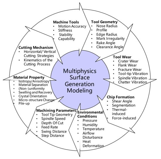 The physical surface generation model in UPM calls for in-depth and in-width knowledge of inherent physical law and mechanisms for material removal. As shown in Figure 12, general factors influencing surface generation include the machine tools, cutting mechanism, machining parameters/conditions, tool geometry, material property, chip formation, tool wear, environmental conditions, and heat deformation. There exist complicated relationships among these factors. The advanced surface generation modeling method is now evolving from the geometric dimension, dynamics dimension to an integrated manner.