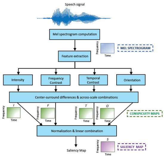 In order to compute the saliency values of the speech signals, in this work we have used the Kalinli’s model [35,36,37], as implemented in [40]. Its simplified block diagram is represented in Figure 1.