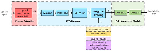 In recent years, several models of auditory saliency have been proposed [30,31,32,33,34]. Among them, in this work, we have considered the auditory saliency model developed by Kalinli et al. [35,36,37] as it is inspired on the central auditory system and has been successfully tested for prominent syllable detection in speech. As demonstrated in [38], listeners can perceive a phoneme or syllable to be more salient than the others due to several circumstances, such as the stress, intensity, or coarticulation between adjacent phonemes. As aforementioned, speech intelligibility can be reflected in some way in these phenomena [2,3], so our hypothesis is that Kalinli’s model can help to detect the salient parts of speech that are more relevant to the determination of the comprehensibility level of an utterance, and, therefore, it is feasible to use it as a kind of weighted pooling model inside our LSTM-based SIC system.