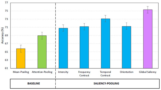 Finally, the best system is Global Saliency, where the weights of the temporal frames are computed from the saliency map that is a linear combination of the four conspicuity maps. In particular, Global Saliency obtains a relative error reduction of with respect to Temporal Contrast, of with respect to attention pooling, of with respect to mean pooling, and of with respect to SVM.