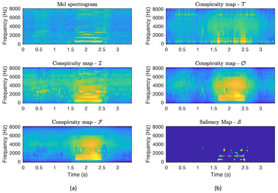 Figure 4 shows the conspicuity and saliency maps produced by the Kalinli’s model over an utterance of low intelligibility belonging to the UA-SPEECH database. This speech signal consists of a hesitation between s and 1 s and the word “jowls” between s and s. In particular, Figure 4a represents from top to bottom, the mel spectrogram, the Intensity and the Frequency Contrast conspicuity maps, whereas Figure 4b depicts the Temporal Contrast and Orientation Conspicuity maps, and the saliency map. On the one hand, it can be observed that Intensity, Frequency Contrast, and Orientation maps are similar, whereas the Temporal Contrast one presents a different structure, being the more conspicuous regions of this map mainly located in the coarticulations (around s and s). In addition, the four conspicuity maps present a certain degree of relevant regions placed in the hesitation event, although it is not a proper speech sound. On the other hand, the saliency map is more abrupt, exhibiting a smaller number of salient regions, all of them belonging to the region where the word “jowls” is located. Note that, in the remaining parts of the utterance, including the hesitation event, there is no salient regions. This fact is due to the normalization algorithm applied on the individual conspicuity maps, prior to their combination to build the final saliency map, that completely removes areas with very low conspicuity values.