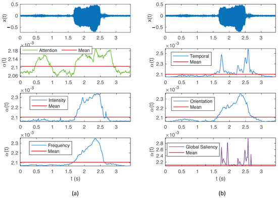 - Kalinli, O.; Narayanan, S.S. A saliency-based auditory attention model with applications to unsupervised prominent syllable detection in speech. In Proceedings of the Interspeech 2007, Antwerp, Belgium, 27–31 August 2007; pp. 1941–1944. [Google Scholar]