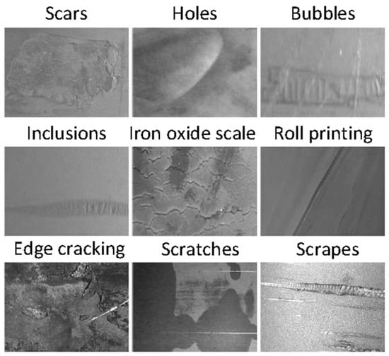 Hot-rolled steel plates will have some surface defects due to the production process and the steel billets; such defects are divided into steel defects and process defects according to the causes [35]. The structure of surface defects is shown in Figure 1. Scars are metal flakes with irregular shapes that attach to the surface of the steel strip. This defect can cause problems such as metal peeling or holes during subsequent processing and utilization. Gas pores are irregularly distributed round or elliptical convex hull defects on the surface of the steel strip, which can cause problems such as delamination or low welding during subsequent processing and utilization [36]. Inclusions are lumpy or elongated inclusive defects in the slab exposed on the surface of the steel strip after the inclusions or slag inclusions are rolled. Such defects will cause holes, cracks and delamination during subsequent processing. Iron oxide scale is a kind of surface defect formed by pressing an iron oxide scale into the surface of the steel strip during the hot rolling process. This defect will affect the surface quality and coating effect of the steel strip. Roll marks are irregularly distributed convex and concave defects on the surface of the steel strip, which can cause folding defects in the rolling process. Edge cracking is a phenomenon in which one or both sides of the steel strip edges are cracked along the length direction, which may cause problems such as interruption of the strip during the subsequent processing and utilization [37]. Scratches are a form of linear mechanical damage on the surface of the steel strip lower than the rolled surface. The scratched iron sheet is difficult to eliminate by pickling after oxidation, which can easily cause breakage or cracking. Scrapes are a form of mechanical damage on the surface of the steel strip in the form of points, strips or blocks. The iron oxide scale at the scrapes is challenging to remove by pickling. Problems such as bending and cracking may be caused [38].