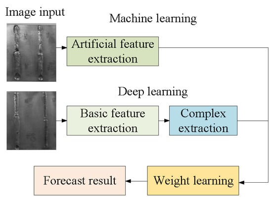 As deep learning technology advances continuously, it gradually presents apparent advantages in image recognition and classification. CNNs can extract image features. The detection ability of neural networks is improved by continuously increasing the number of layers and network widths of CNNs [43]. Such an improvement can effectively avoid subjectivity and inefficiency in the manual extraction process. Research on recognizing weld defect images is varied; especially, deep learning technology processes and organizes a single feature to quantify the abstract features according to the extraction principle, thereby using these features to classify and recognize images [44]. Figure 2 shows the difference between traditional machine learning and deep learning processes. Deep learning can obtain high-dimensional image features from the input data, fit the features and finally utilize the learning method of weights to increase the accuracy of classification prediction. However, while analyzing welds of industrial steel plates, deep learning cannot learn due to the lack of complete datasets; in addition, current research primarily focuses on improving the weld recognition ability; however, a complete automatic detection system has never been built, increasing the difficulty in actual industrial applications [45].