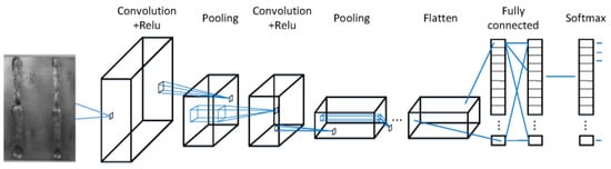 The CNN is a useful supervised deep learning model. It is a feed-forward neural network whose artificial neurons can respond to some surrounding units within the coverage [49]. CNNs are widely applied to image recognition, including AlexNet, Visual Geometry Group Nets (VGGNets) and other models that reduce the recognition error rate of CNNs on a typical ImageNet dataset. Generally, deep learning models have at least three hidden layers. As the number of hidden layers increases, the model’s parameters will also increase, thereby increasing the complexity of the model, providing the possibility to complete more complicated tasks. If a shallow model in which each layer of the network is fully connected is adopted for image classification and recognition, this model will contain many parameters. In the case of multiple hidden layers, the parameters contained in the model will exhibit explosive growth, causing adverse impacts on the space occupation, iterative calculation and convergence speed of the model. The hidden layers in CNNs can significantly reduce the number of parameters in the model via weight sharing and sparse connections, thereby increasing the training speed of the model [50]. Figure 3 shows the structure of the CNN.