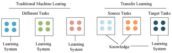 TL can meet the end-to-end needs in practical applications with more expressive features. It is a deep learning method that uses existing knowledge to solve problems in different but related domains. TL has become another popular research direction in deep learning [51]. Compared with traditional machine learning methods, TL directly improves the learning effect on different tasks, focuses on applying good source domain task knowledge to different but related target problems, and enables computers to learn by analogy without relying on big data for initial learning in every field. The training of traditional machine learning models requires labeled data from various fields, while data in different fields do not have TL performance on the same model. TL can utilize existing knowledge to learn new knowledge. Figure 4 shows the structural comparison between traditional machine learning and transfer learning. TL can organically utilize the knowledge in the source domain to better model the target domain under the condition of changes in data distribution, feature dimensions and model output conditions [52].