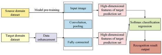 (3) TL process: The first step is model pre-training, performed on a large, challenging image dataset. This dataset contains sufficient image data resources so that the VGG16 model can obtain the weights of each layer by training the source domain dataset. The second step is model transfer. Based on model pre-training, its convolutional layer and pooling layer parameters are retained as the frozen layer. The fully connected layer and the input image size of the model are changed to adapt to the model input requirements and defect recognition types. Afterward, the data are retrained, and finally, tasks of classification and recognition are completed. The third step is model fine-tuning. This operation can perform good fitting and extract image features during the training process, initialize the model during the target domain training and utilize the backpropagation algorithm and Stochastic Gradient Descent (SGD) algorithm to fine-tune and correct the model parameters until the training task is completed or the training end condition is reached. Eventually, a model with excellent generalization ability is obtained. Here, the SoftMax classifier is adopted to classify and output the recognition results. The specific structure is presented in Figure 5.